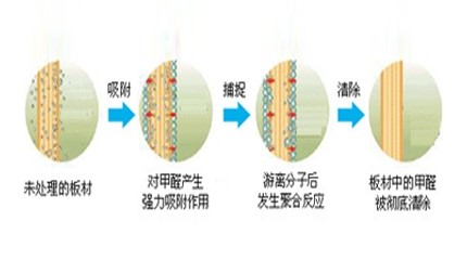 配合特效溶解酶將甲醛滲透分解后,再次對甲醛進行瞬間吸附,立即聚合,然后進行強力分解。