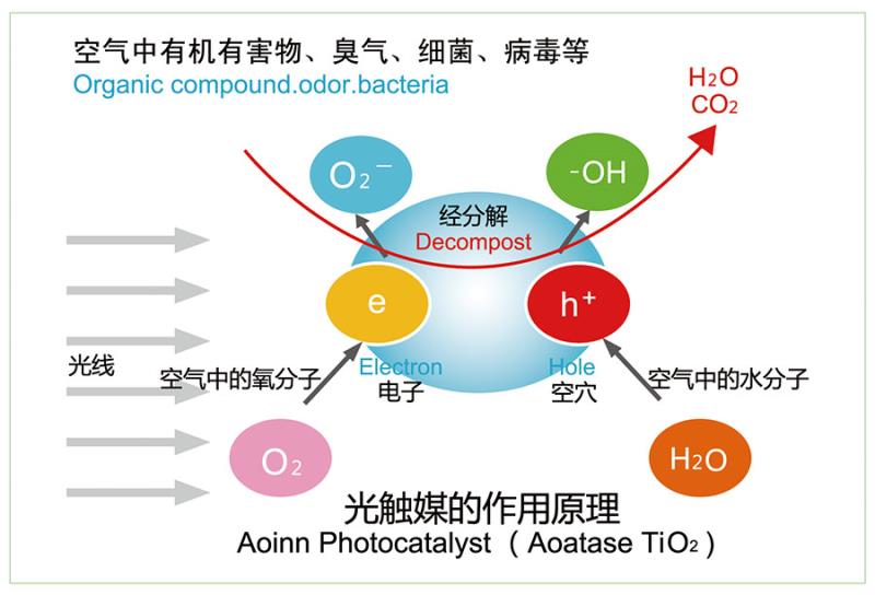 光觸媒是一種納米級的金屬氧化物材料(二氧化鈦比較常用),它知涂布于基材表面,干燥后形成薄膜,在光線的作用下,產生強烈催化降解功能:能有道效地降解空氣中有毒有害氣體;能有效殺滅多種細菌,抗菌率高達90%以上,并能將細菌或真菌釋放出的毒素分解及無害化處理;同時還具備除臭、抗污等功能。光回觸媒是光+觸媒(催化劑)的合成詞。光觸媒是一種以納米級二氧化鈦為代表的具有光催化功能的光半導體材料的總稱,是當前國際上治理室內環境污染的最理想材料。